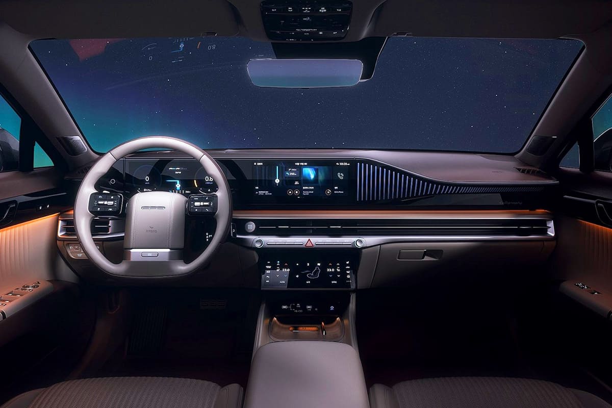 그랜저 실내는 정숙성과 고급 소재의 조화, 디지털화된 UX로 프리미엄 대형 세단의 기준을 보여줍니다.
